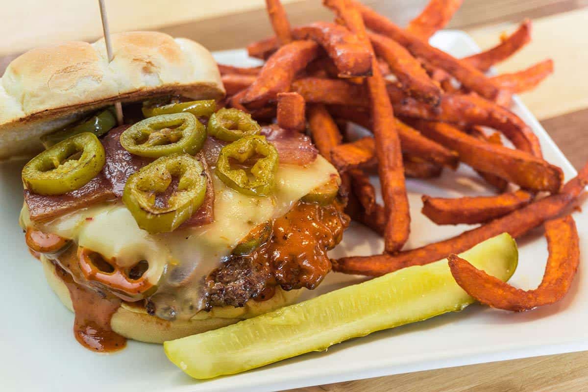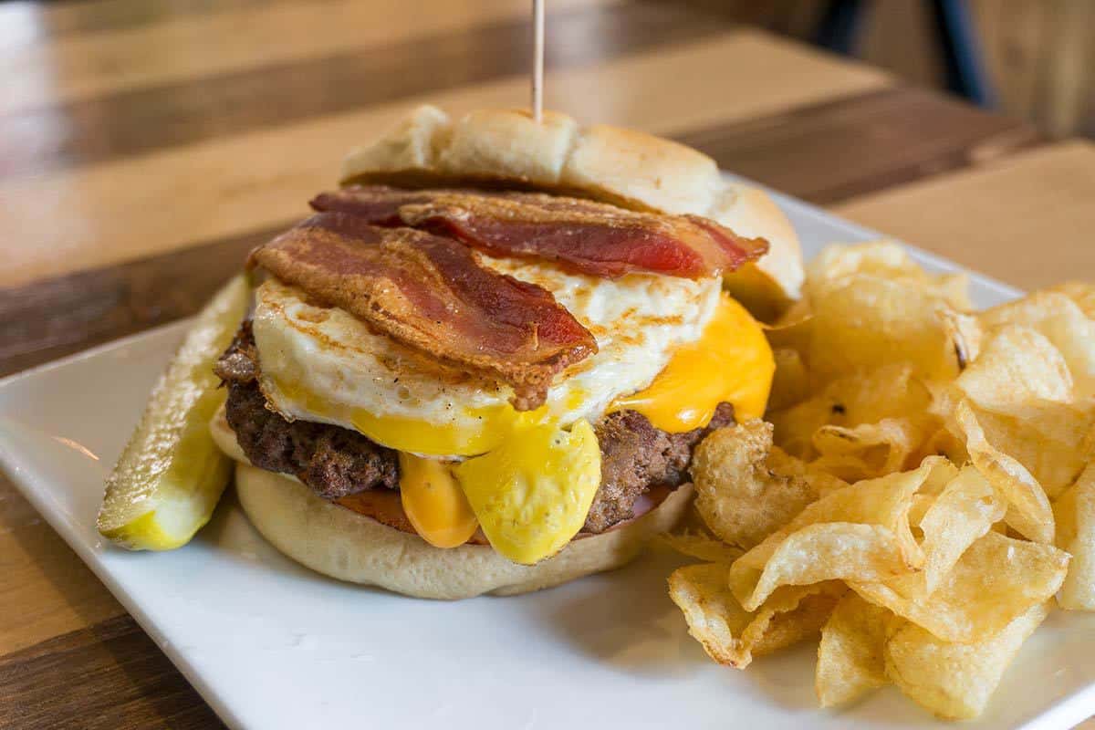 Two 1/3 lb. burgers topped with bacon and melted cheese